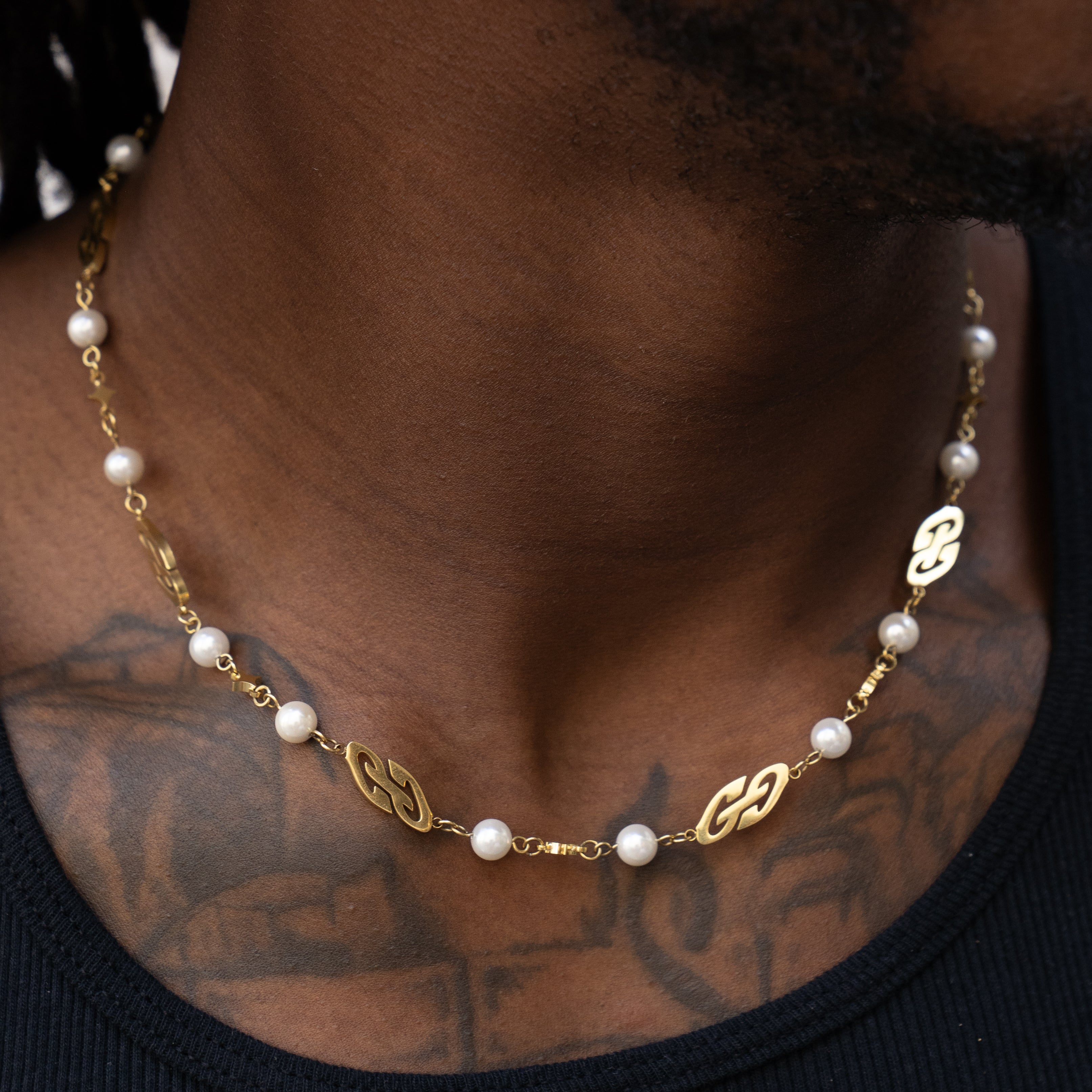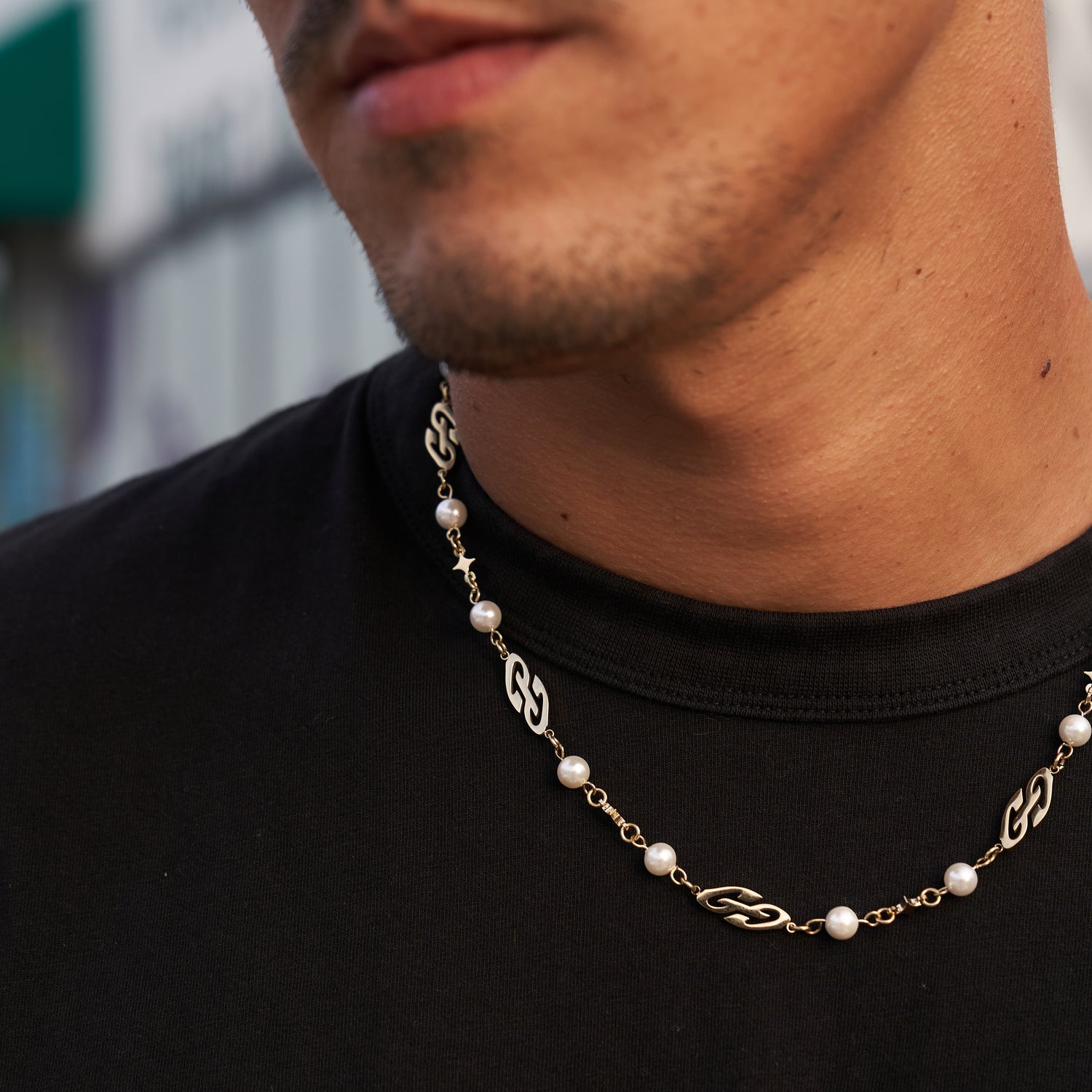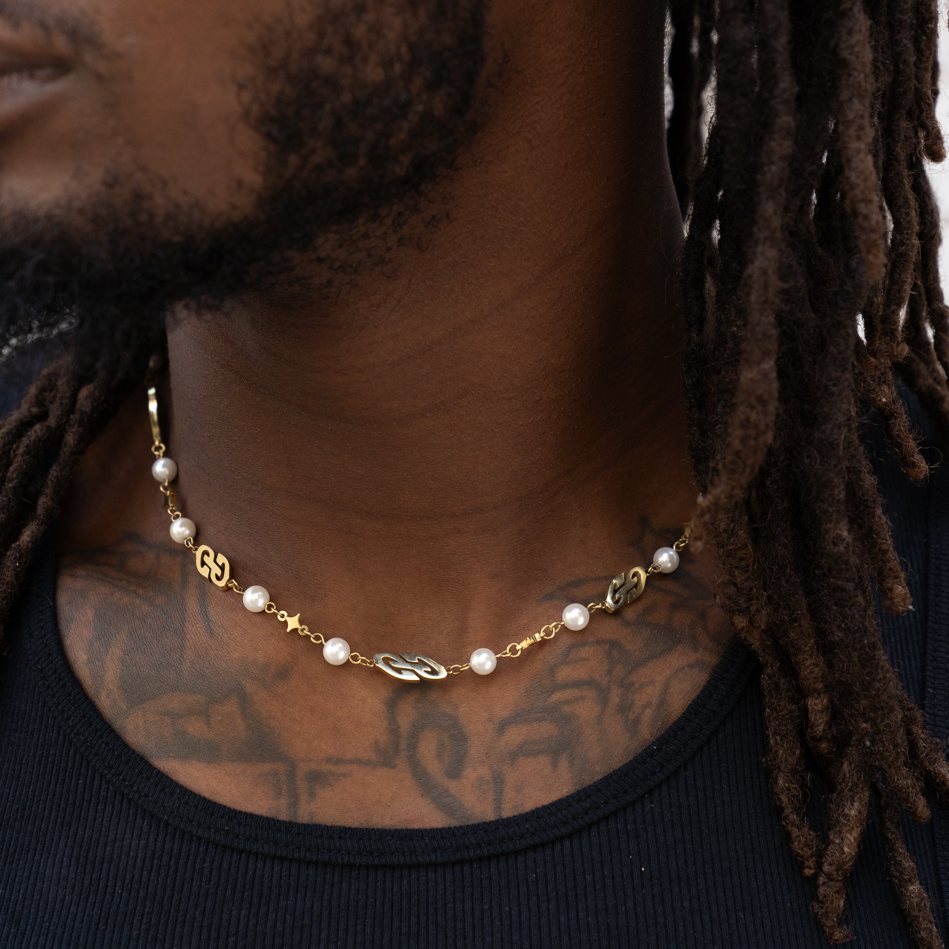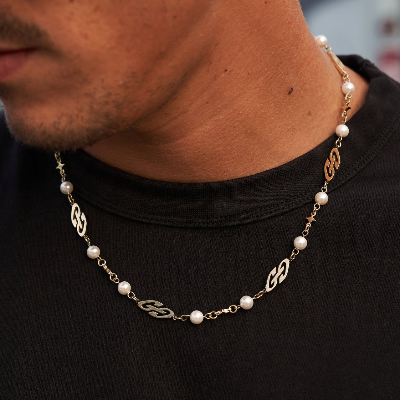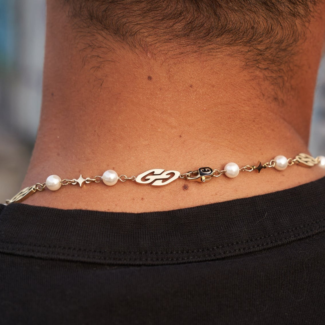 GG Logo Pearl and Stars Necklace - Yellow Gold